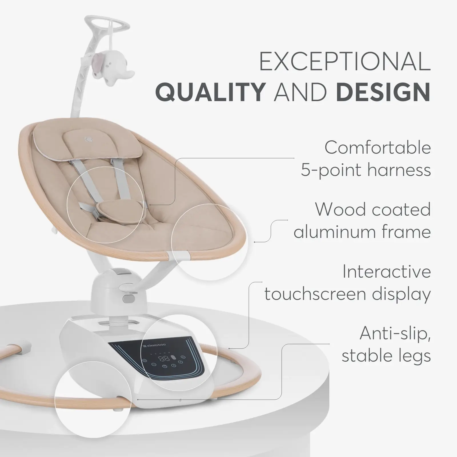 Designed with a lightweight aluminum frame, elegant wooden coating and premium fabrics, BEEMOOVE combines style and functionality, offering a safe and relaxing environment for your baby.