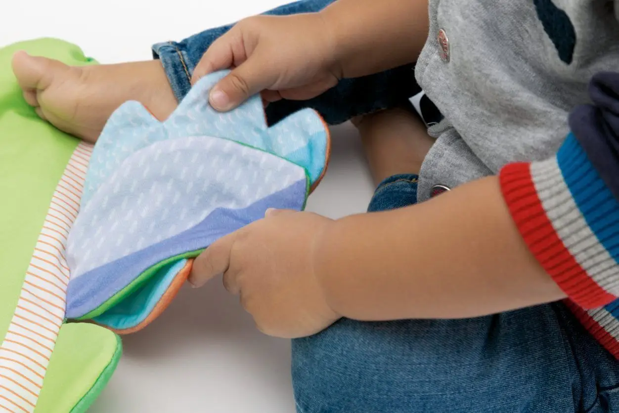 The mat provides the child with many tactile stimuli thanks to the insert filled with water and inflated with air. On the surface of the crocodile there are elements covered with materials of various structures for even greater sensory experiences of the child. 2 leaves are attached to the toy, which make a rustling sound when touched, providing auditory stimuli and attracting the toddler’s attention.