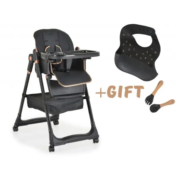 Set of high chair, silicone bib, spoon and fork;PU cushion;4 wheels with stoppers;2-layered feeding tray;4 positions of the feeding tray;3 positions of the backrest;5 height positions;3 positions of the angle of the footrest;Shoulder pads;5-point restraint system.