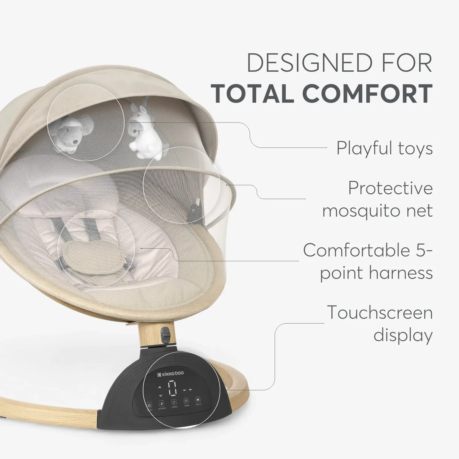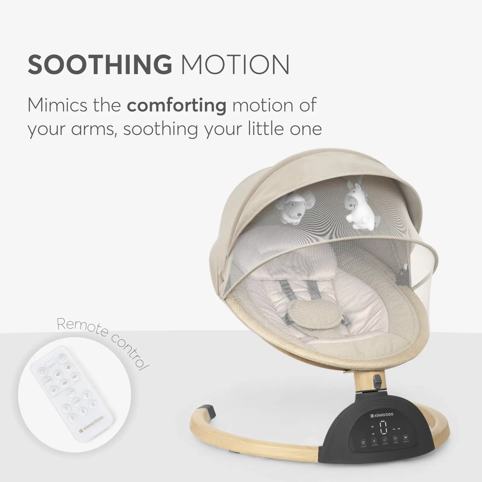 The ASHLEE electrical swing can be used by newborns weighing up to 9 kg. Crafted with a lightweight aluminum frame and an elegant wooden coating, this product combines style with functionality, offering a serene environment for your baby.