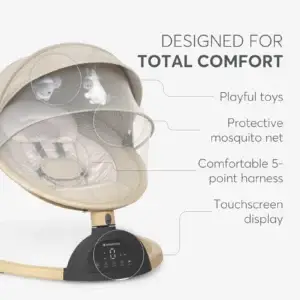 - Comfort & Safety – Offers a detachable canopy with a mosquito net and sunshade extension to protect your baby. The swing also includes a 5-point harness system and anti-slip legs for safety.