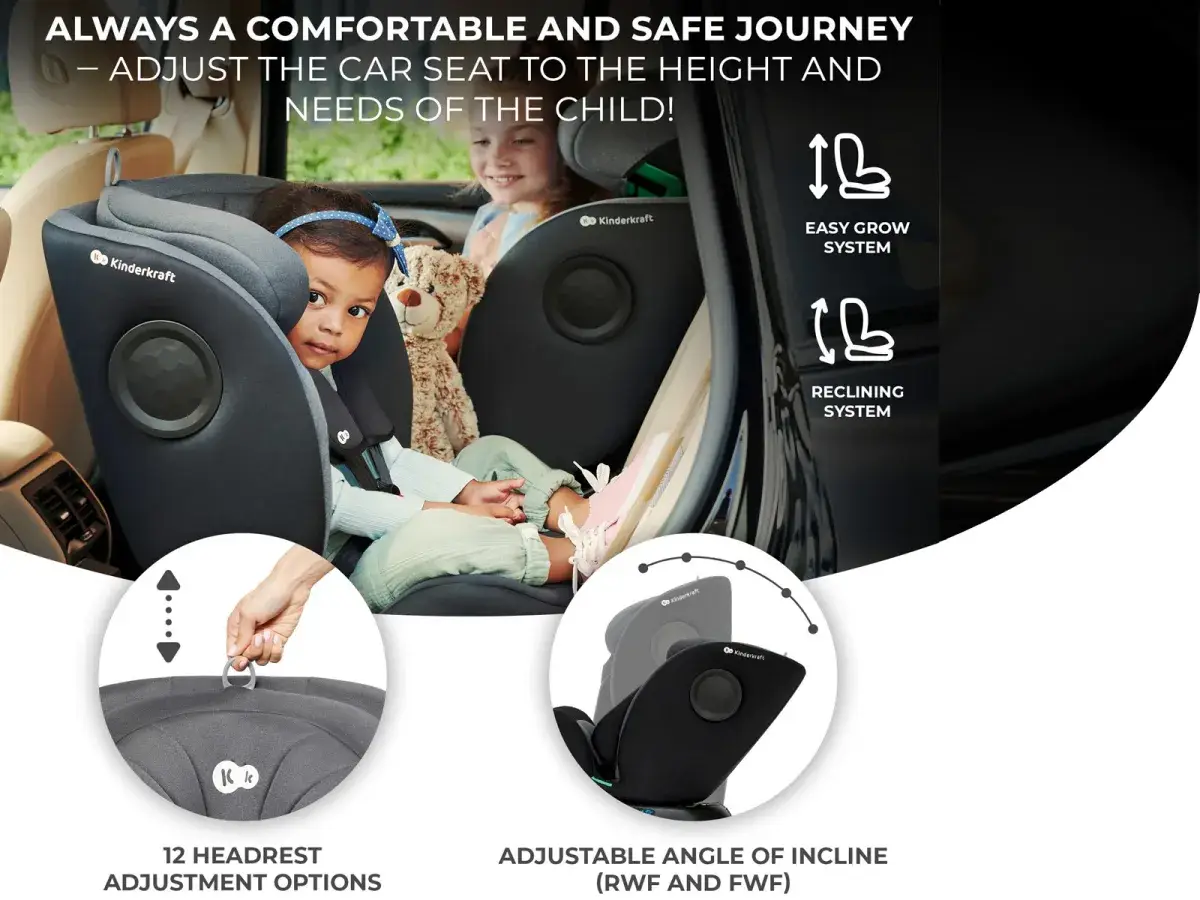 The I-360 i-Size allows you to transport your child in a rearward facing position (RWF) up to about 4 years of age! Transporting children in the rearward facing position is up to 5 times safer in the event of frontal collisions. And when it’s time to transport them in the forward facing position, you can easily rotate the car seat without the need for uninstalling it from the car. The I-360 i-Size will protect your child throughout the entire journey in the car seat thanks to its twelve headrest adjustment options and five angle of incline adjustment options.