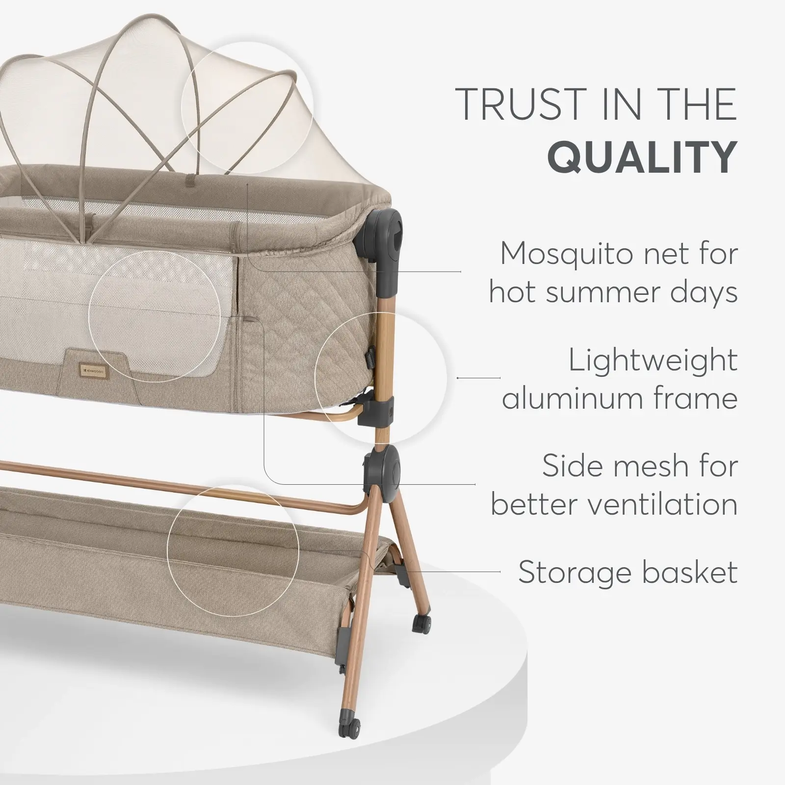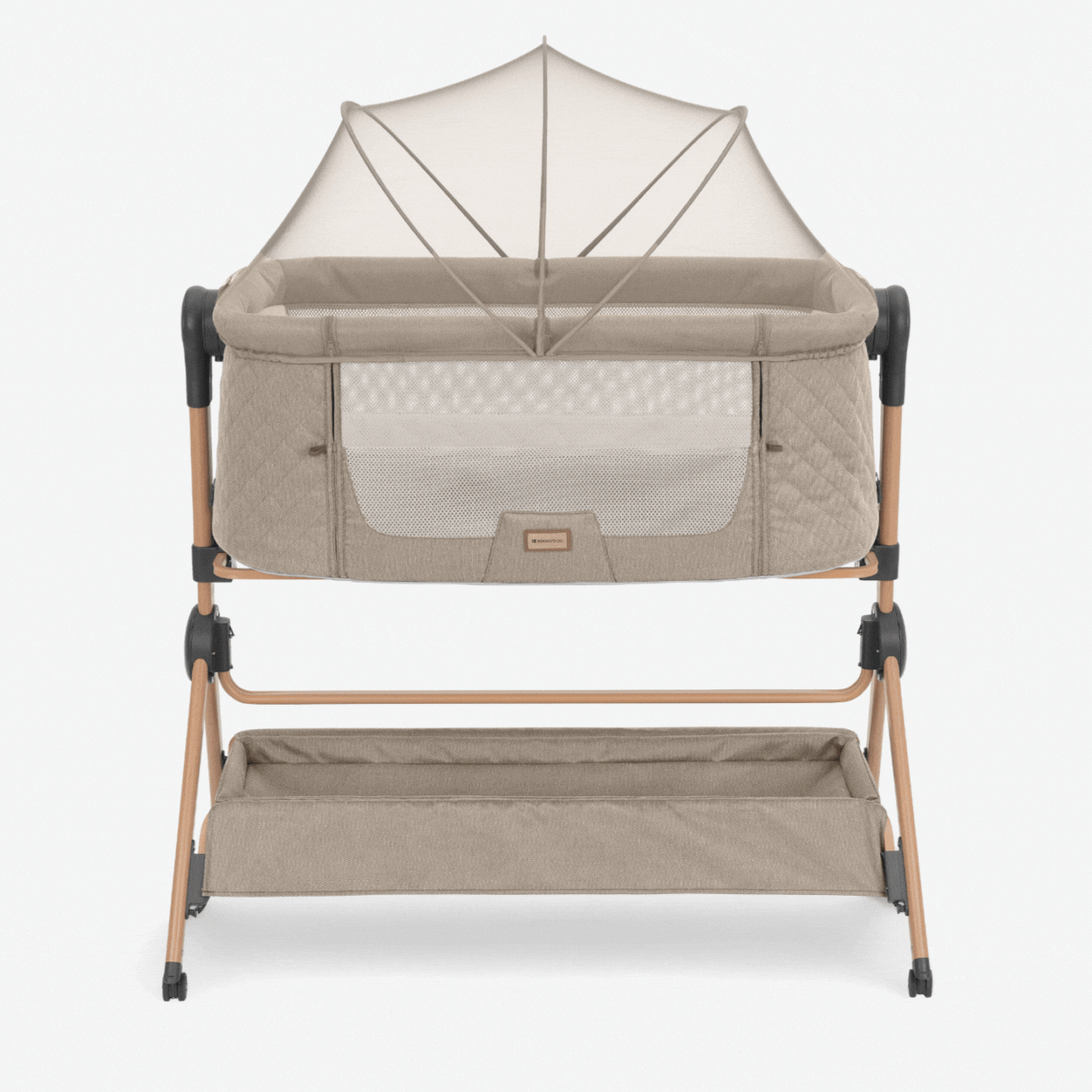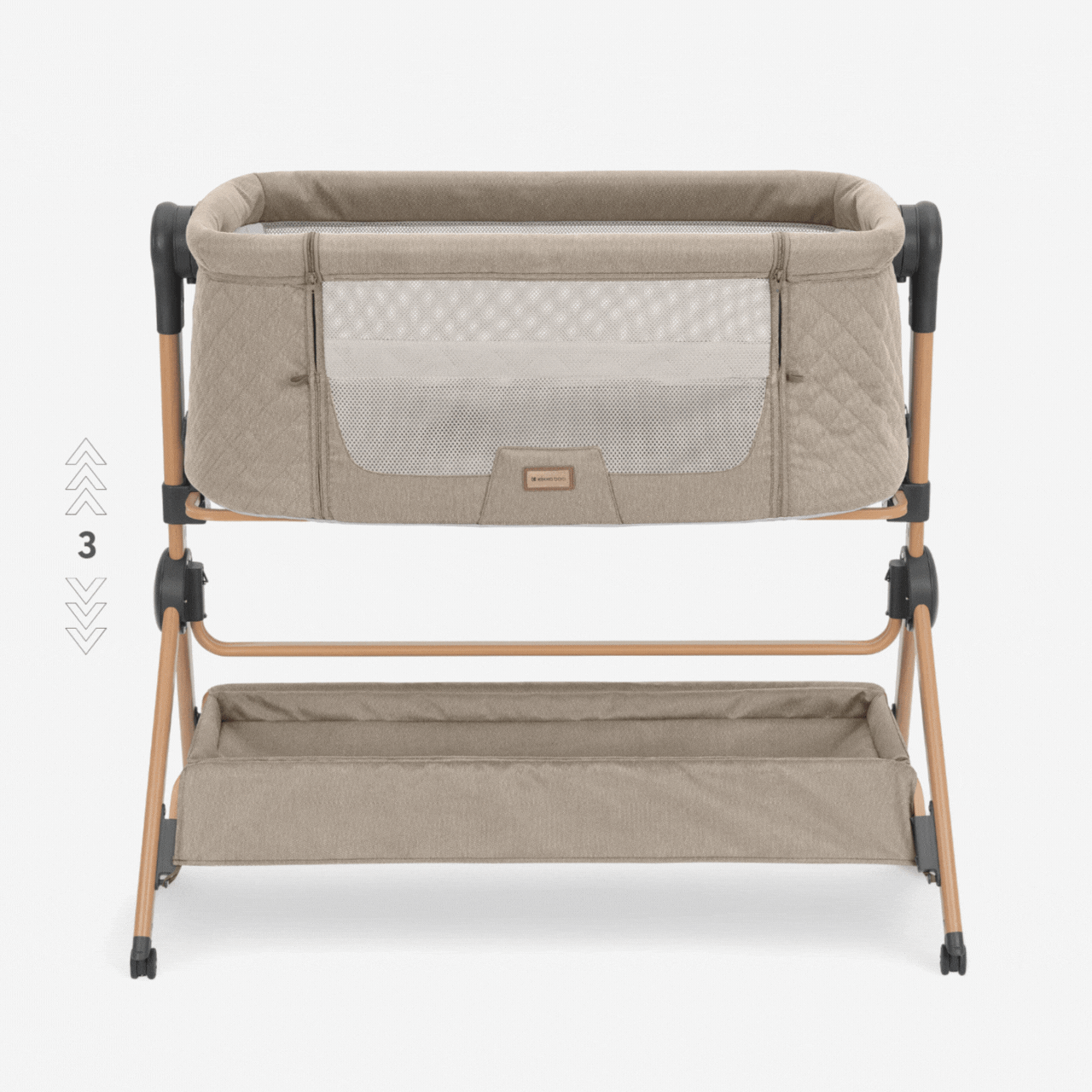 Bedside Crib – Suitable from birth up to 6 months (up to 9kg), with adjustable height, anti-reflux positioning, mesh panels for airflow, dropping front side and a strap to fix the cot to the parent’s bed for e peaceful night rest.