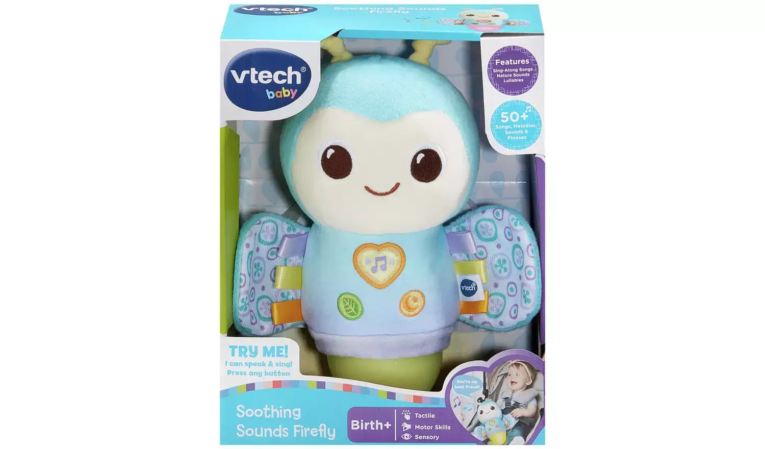 Soft and cuddly firefly featuring a colour changing light to soothe little one. Enjoy relaxing melodies, adorable sing-along songs and fun phrases when pressing firefly’s heart button. Pressing the leaf button plays calming nature sounds, whilst the moon button triggers soothing lullabies. Includes a 15, 30 or 45 minute timer. WARNING Keep this soft toy out of the sleeping environment for babies under twelve months to avoid suffocation risk.